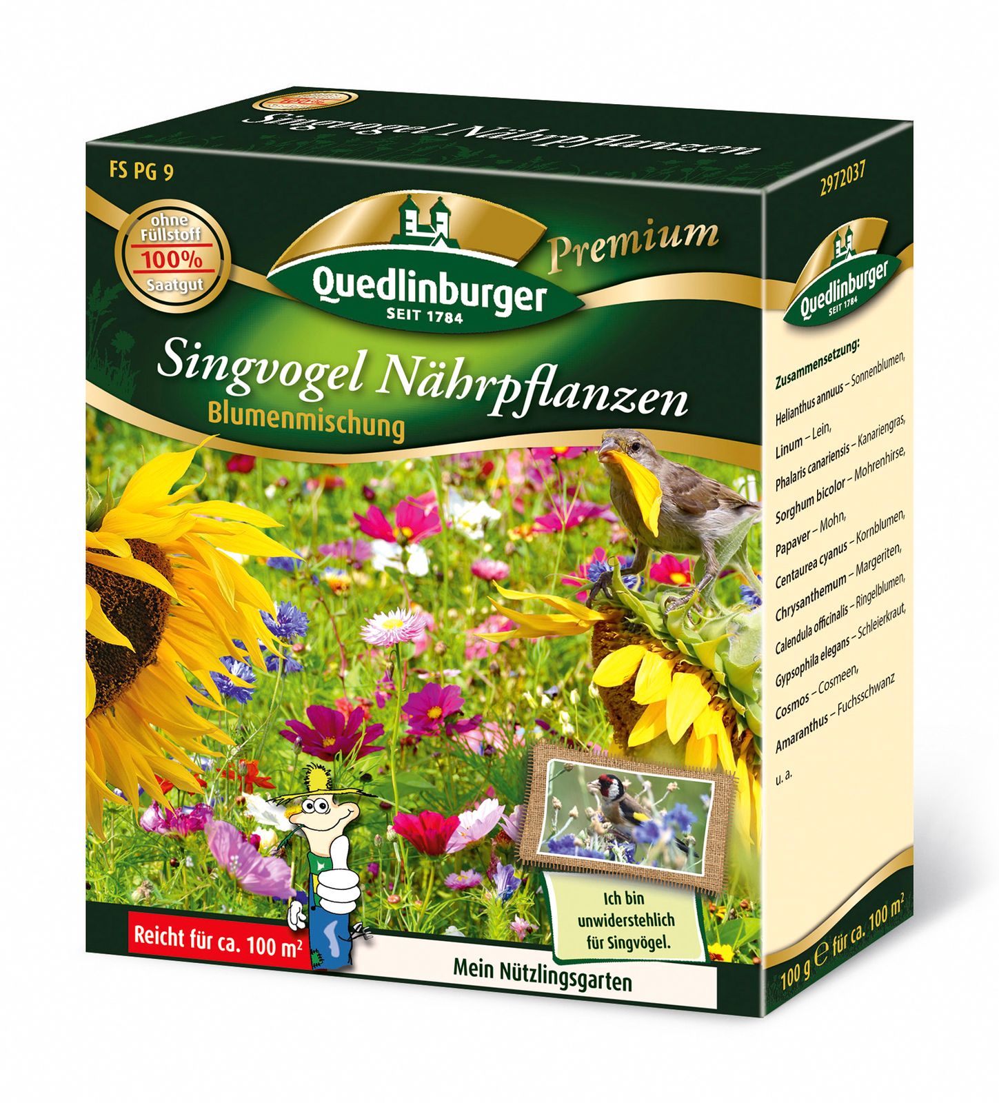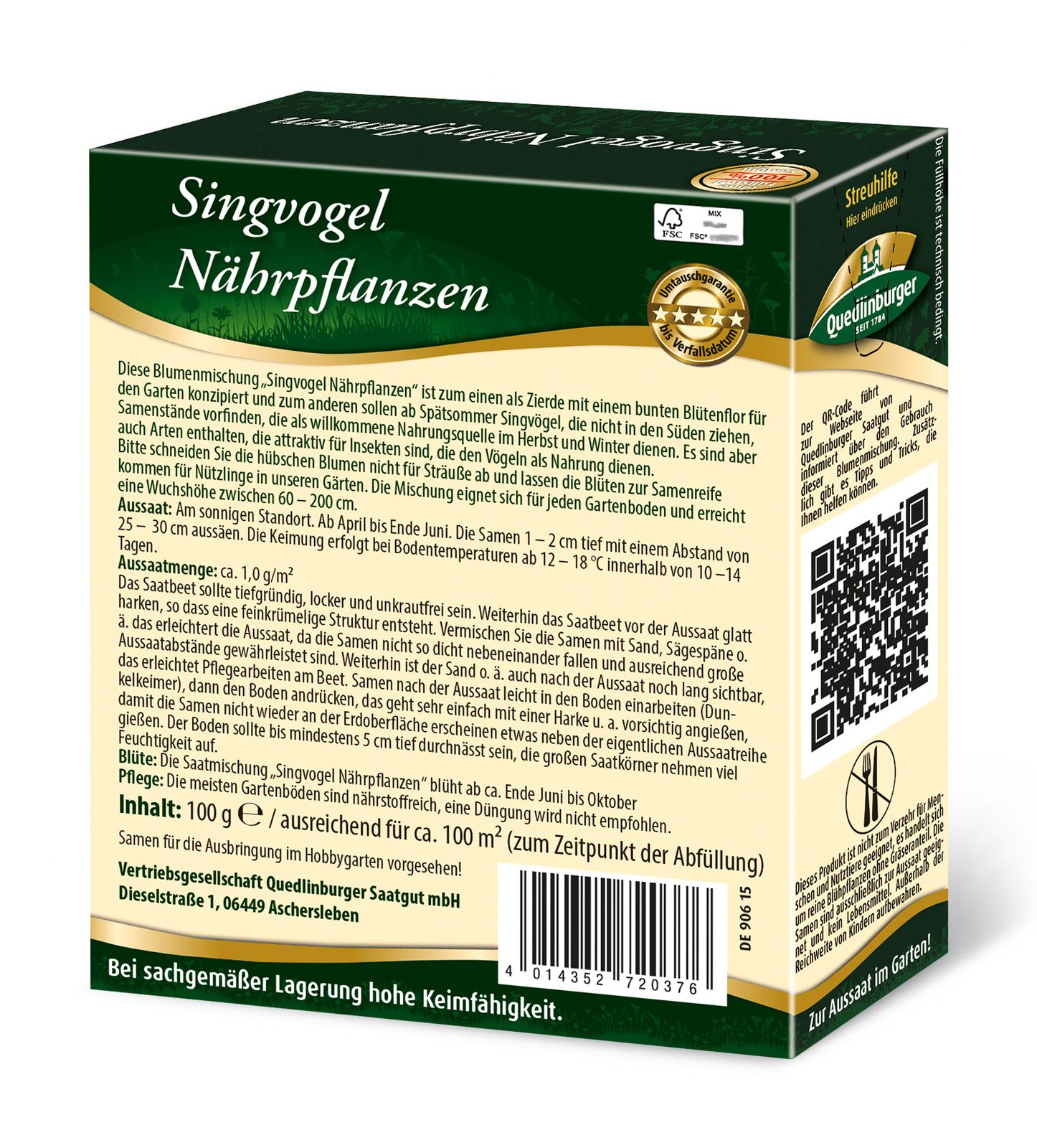 Diese einjährige Blumenmischung "Singvogel Nährpflanzen" ist zum einen als Zierde mit einem bunten Blütenflor für den Garten konzipiert und zum anderen sollen ab Spätsommer Singvögel, die nicht in den Süden ziehen, Samenstände vorfinden, die als willkommene Nahrungsquelle im Herbst und Winter dienen. Es sind aber auch Arten enthalten, die attraktiv für Insekten sind, die den Vögeln als Nahrung dienen. Bitte schneiden Sie die Blumen nicht für Sträuße ab. Lassen Sie die Blüten zur Samenreife kommen für Nützlinge in unseren Gärten. Die Mischung eignet sich für jeden Gartenboden und erreicht eine Wuchshöhe von 60 - 200 cm.