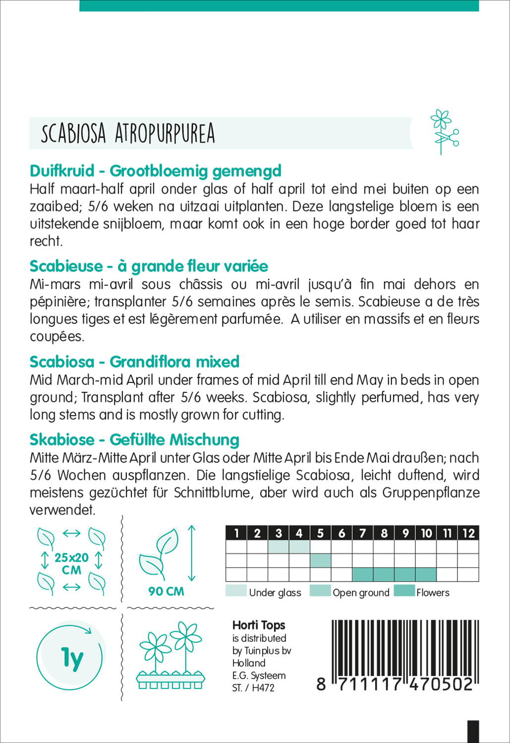 Skabiose - Gefüllte Mischung Mitte März-Mitte April unter Glas oder Mitte April bis Ende Mai draußen; nach 5/6 Wochen auspflanzen. Die langstielige Scabiosa, leicht duftend, wird meistens gezüchtet für Schnittblume, aber wird auch als Gruppenpflanze verwendet.